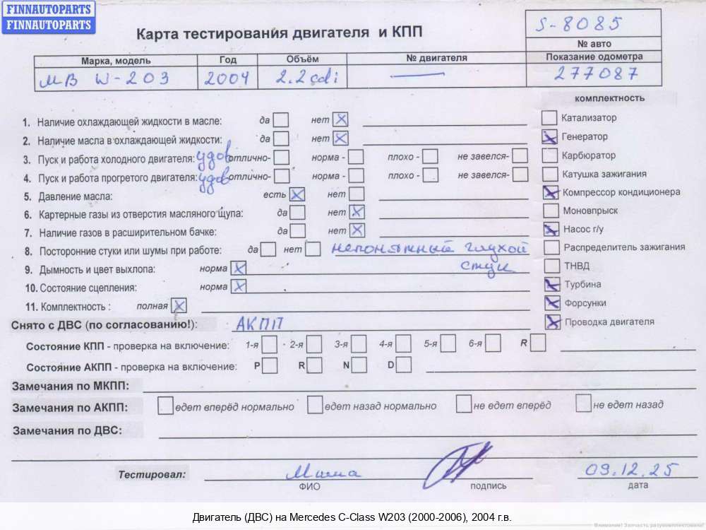 2003; Дизель; 2.2; OM 646.963, CDI; Универсал; ; серебристый; 2003, 2.2л, Дизель, CDI, OM 646.963, 64696330130704, A6460104102, Универсал, серебристый, 64696330130704 | - | Г | К | Н | КК | ТУ, прокручивается , состояние ГРМ - нормально, поддон -нормально, клапанная крышка - нормально, эмульсия - нет, треснут воздухозаборник , дефект шкива г/у и компрессора,